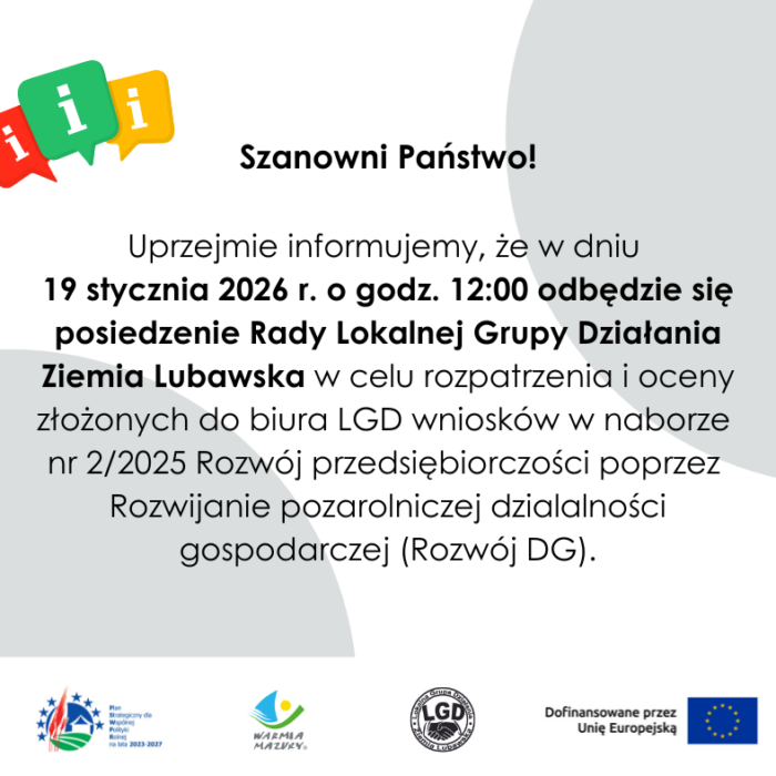 Na podstawie §7 ust. 2 Regulaminu Funkcjonowania Rady Lokalnej Grupy Działania Ziemia Lubawska informujemy, iż w dniu 19.01.2026 r. o godz. 12:00 w Lubawskim Centrum Aktywności Społecznej, odbędzie się...