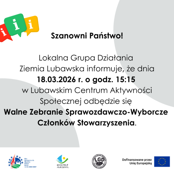 Lokalna Grupa Działania Ziemia Lubawska informuje, że dnia 18.03.2026 r. o godz. 15:15 w Lubawskim Centrum Aktywności Społecznej przy ul. Biskupów Chełmińskich 1 w Lubawie, odbędzie się Walne Zebranie Sprawozdawczo-Wyborcze Członków...